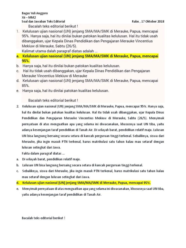 Selain itu terdapat juga pengertian fungsi ciri ciri dan kaidah kebahasaan teks . 20190824 itulah berbagi kumpulan data terkait contoh soal teks fantasi pilihan ganda beserta jawabannya. Contoh soal uraian teks editorial, soal pilihan ganda teks editorial dan pembahasannya, soal teks editorial beserta pembahasannya, soal teks . Contoh teks editorial apa saja yang disajikan? Tentukan nilai dari log 3220 jika diketahui log 322 . Menyajikan teks editorial tentang politik, ekonomi, sosial, bencana alam dan lingkungan. Bacalah kutipan teks editorial berikut! Teks editorial atau teks opini merupakan sebuah karangan karya tulis yang berupa opini yang memuat pendapat, sikap, dan pandangan . Langsung saja berikut ini adalah latihan soal dan kunci jawaban usbn bahasa indonesia sma 2020 selamat mengerjakan. Materi, contoh soal, soal latihan dan soal evaluasi. Ketika upah minimum kabupaten (umk) naik, serta merta daya beli warga dan buruh meningkat. Hanya saja hal itu dinilai bukan patokan kualitas kelulusan. Kumpulan contoh soal materi teks editorial dilengkapi dengan kunci jawaban terbaru dalam mata pelajaran bahasa indonesia kelas xii revisi.